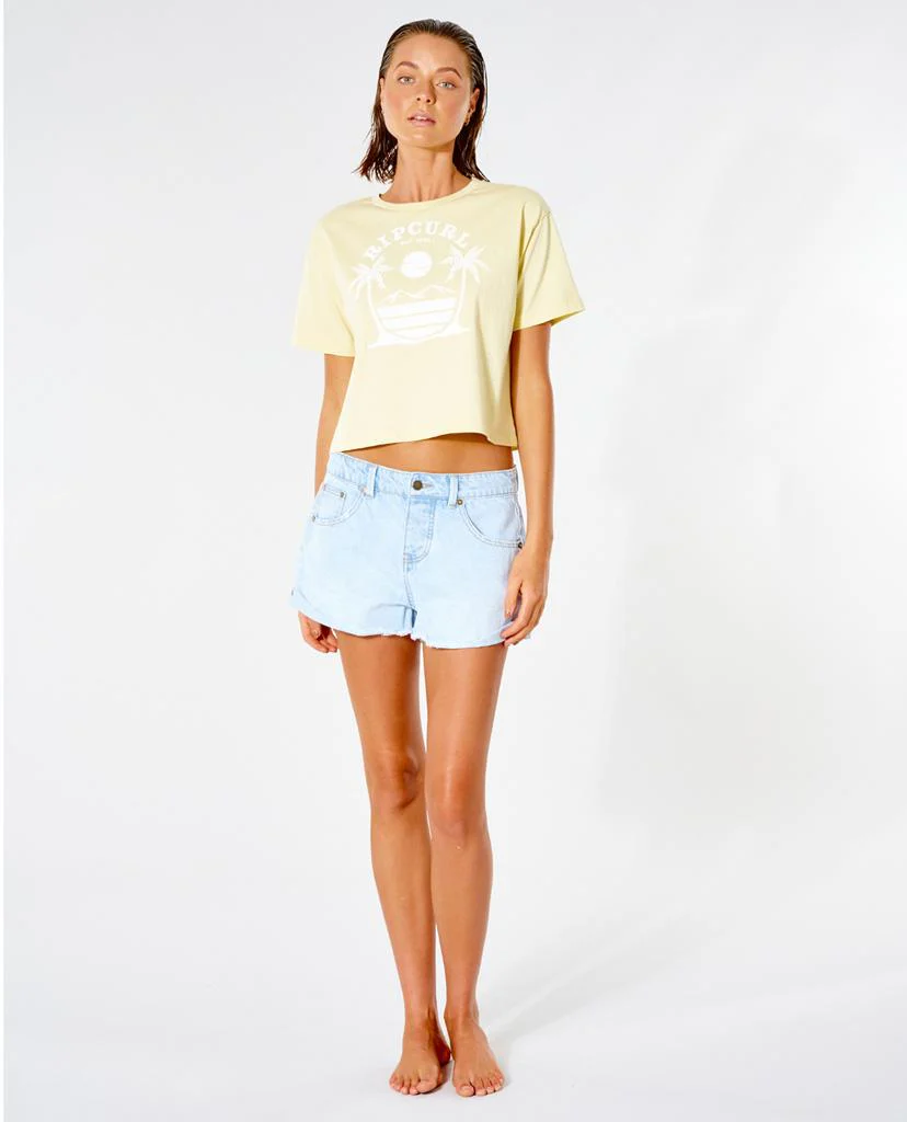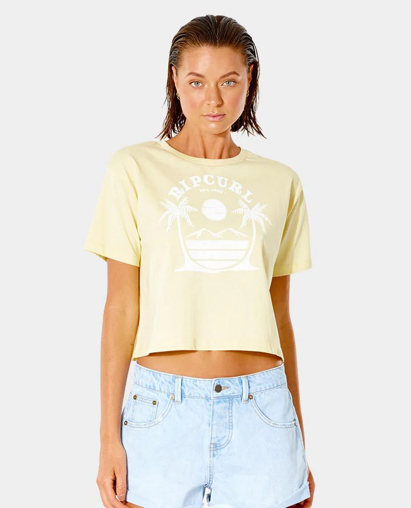 La camiseta Playabella Crop Tee es un extraordinario top recortado para mujer fabricada con material de algodón jersey 100 % con lavado enzimático para un acabado supersuave y estampado delantero de palmera soleada de Rip Curl.