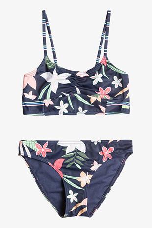 El conjunto de bikini de Roxy para niña es fundamental para los días de playa y piscina. Cuenta con tejido suave, resistente y elástico para todo terreno. Es un conjunto de bikini crop con fruncido en el frente, escote redondo y correas ajustables con anillos y deslizadores para más comodidad. Además, verás la placa de goma de la marca Roxy.